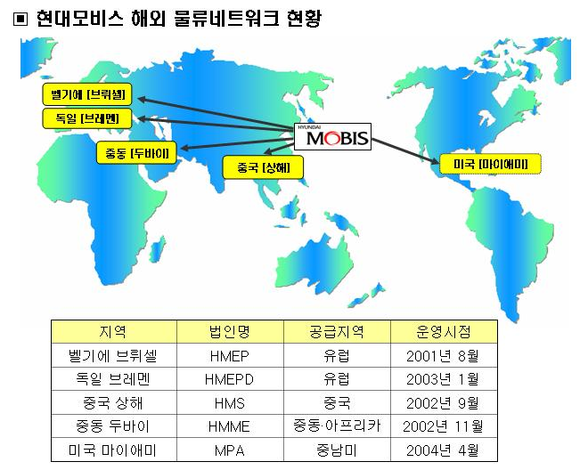 한편, 현대모비스는 해외 5개 물류센터를 통해 2004년에는 올해보다 18% 증가한 총 2억 9천만 달러의 매출을 올릴 것으로 예상하고 있으며, 앞으로 매년 15% 정도의 매출성장을 달성해 나갈 계획이다.