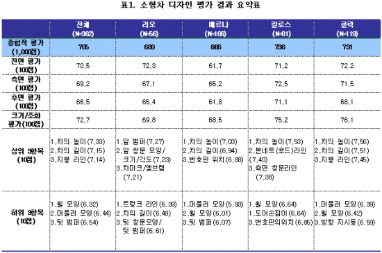 조사를 진행한 에프인사이드는 "소형차 종합평가 평균점수는 705점(1,000점 만점)으로 준중형 평균 714점에 비해 다소 떨어졌다"며 "부문별로는 크기와 조화에 대한 평가가 72.9점으로 가장 높았고 그 다음은 전면 디자인(70.5점), 측면 디자인(69.2점), 후면 디자인(66.5점) 순으로 나타났다"고 말했다.