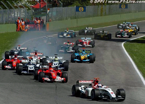 | 사진=www.F1-live.com, F1 제4전 산마리노 그랑프리에서 젠슨 버튼(맨앞)이 경주차의 대열을 이끌고 첫 코너로 뛰어들고 있다. |