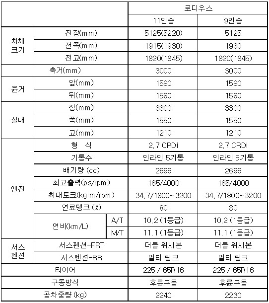 한편, 로디우스는 9인승/11인승에 각각 RD300, RD400, RD500 등 3개 모델을 선보여 12일부터 판매에 들어간다. 차값은 2,070만원(11인승, 수동변속기 기준)부터 고급사양이 적용된 최고급형은 2,745만원(11인승, 수동변속기 기준)으로 다양한 가격대를 통해 고객의 선택폭을 넓혔다.