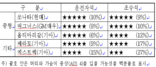 건교부는 1999년 정면충돌 안전성 평가를 시작으로 2001년에 제동성능, 2003년에는 측면충돌 안전성을 추가하는 등 이번까지총 36개 차종에 대해 평가를 진행했다. 올해 평가결과 주목할 만한 사실은 쏘나타가 국내 최초로 충돌안전성 전 부문(정면충돌의 운전석과 조수석, 측면충돌의 운전석 등 3개 부문)에서 최고등급인 별 5개를 받은 것. 이는 안전도 향상을 위한 정부와 제작사의 노력이 열매를 맺은 것으로, 국산 자동차가 세계시장에서 더욱 경쟁력을 가질 수 있는 계기가 될 것으로 보여진다.