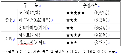 자동차 안전도평가는 자동차의 안전도에 대한 정보를 소비자에게 제공하고, 자동차메이커로 하여금 보다 안전한 자동차를 만들도록 유도하기 위해 정부가 자동차의 안전도를 비교, 평가해 발표하는 제도다. 올해는 중형 승용차인 기아 옵티마 리갈, 현대 쏘나타 및 GM대우 매그너스, 소형 승용차인 기아 쎄라토와 레저용 승용차인 기아 엑스트렉 등 5개 차종에 대해 자동차성능시험연구소에서 평가시험을 실시했으며 그 결과 쏘나타의 안전성이 가장 뛰어난 것으로 나타났다.