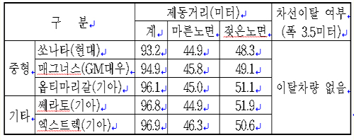 ABS 제동장치가 달린 차로 마른 노면과 젖은 노면에서 시속 100km로 주행중 급제동했을 때의 제동거리와 차선 이탈여부를 확인하는 제동성능부문에서는 마른 노면과 젖은 노면에서 쏘나타가 각각 44.9m와 48.3m, 매그너스는 각각 45.8m와 49.1m로 나타나는 등 평가대상 자동차 모두가 비교적 적정한 것으로 평가됐다. 급제동 시 차선을 이탈한 차는 없었다.