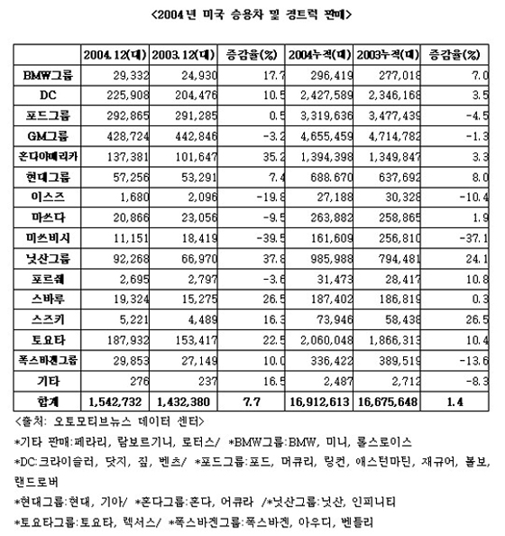 오토모티브뉴스의 2004년 승용차 및 경트럭 판매집계에 따르면 미국 전체 판매실적은 1,691만대였다. 토요타와 닛산은 각각 10.4%와 24.1%씩 전년 대비 판매증가율이 두 배 이상이었으며 혼다는 3.3% 늘었다. 포드는 4.5%, GM은 1.3%씩 각각 감소했다. 12월의 경우 혼다는 전년동월 대비 35.2%, 닛산은 SUV 패스파인더의 호조로 37.8%, 토요타 역시 22.5% 신장했다. 포드는 익스플로러와 익스페디션 등 SUV 판매약화 때문인 것으로 분석하고 새해에는 머스탱과 500 등으로 시장회복에 나설 계획이다.