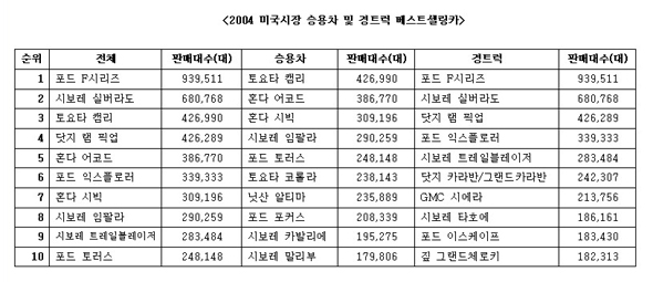 한편, 2004년 미국 승용차 및 경트럭 베스트 톱10 가운데 1위는 93만9,511대가 팔린 포드 F시리즈가 차지했다. 2위는 시보레 실버라도(68만768대), 3위 토요타 캠리(42만6,990대), 4위 닷지 램 픽업(42만6,289대), 5위는 혼다 어코드(38만6,770대)였다. 그 뒤를 포드 익스플로러(33만9,333대), 혼다 시빅(30만9,196대), 시보레 임팔라(29만259대), 시보레 트레일블레이저(28만3,484대), 포드 토러스(24만8,148대)가 각각 이었다. 승용차부문에서는 캠리, 어코드, 시빅 등 일본업체들이 1~3위를 독점했다. 경트럭부문에서는 F시리즈, 실버라도, 램 픽업 등 미국 빅3가 각각 1~3위를 기록했다.