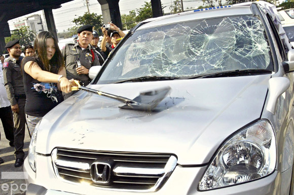 | 방콕에서 20대 여성 운전자가 최근 새로 산 혼다 CR-V를 삽으로 내리침. |