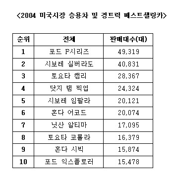 이 밖에 혼다는 9.6%, 토요타는 1.5%씩 각각 판매가 뒷걸음쳤다. 다임러크라이슬러도 1.2% 적은 16만212대를 팔았다. 이는 크라이슬러 디비전의 판매가 1% 증가했음에도 세계 5위 자동차업체인 벤츠 브랜드 판매가 20% 떨어졌기 때문. 반면 닛산의 판매대수는 7만6,584대로 6.1% 증가했다. 또 폭스바겐은 1% 정도, 현대는 5.9%, BMW는 22.5%씩 각각 증가했다.