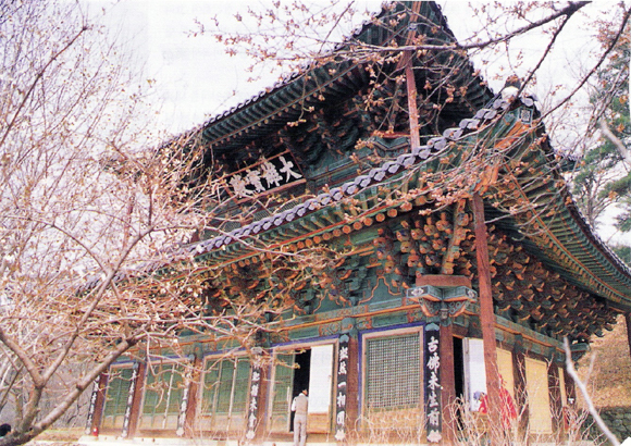 특이한 2층 건물의 대웅보전(보물 제801호)과 대광보전(보물 제802호)은 1층이 앞면 5칸, 옆면 4칸이고 2층이 앞면 3칸, 옆면 3칸의 화려한 건축물이다. 건물 2층에 걸려 있는 현판은 신라 명필 김 생의 글씨라고 한다. 4월초면 대웅보전을 에워싼 목련 등의 꽃나무가 망울을 터뜨린다. 스님들이 공부하는 요사채에는 매화가 분분하다. 정갈한 기와 위로 연분홍 꽃잎이 눈송이처럼 날리는 풍경은 아득한 그리움을 느끼게 한다.