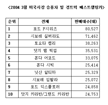 모델별로는 포드 F시리즈가 8만527로 부동의 1위를 지켰다. 2~6위는 시보레 실버라도(7만1,462대), 토요타 캠리(3만8,263대), 닷지 램 픽업(3만5,531대), 혼다 어코드(3만3,075대), 혼다 시빅(2만5,414대) 순으로 지난 2월과 순위가 같았다. 7위의 경우 오랜만에 닛산 알티마(2만5,329)가 올라왔으며 그 뒤를 시보레 임팔라(2만5,072대), 포드 익스플로러(2만4,858대), 닷지 카라반 및 그랜드카라반(2만4,753대)이 이었다.