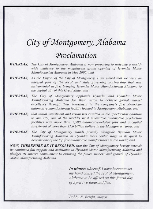 결의문은 몽고메리시와 카운티, 몽고메리 상공회의소 명의의 결의서 3부로 작성돼 있다. 내용은 현대의 성공적 발전이 시 지역사회의 번영을 가져온다는 걸 인식하고 현대 앨라배마공장의 성공과 지속적인 성장을 위해 지원과 협조를 다하겠다는 것이다.