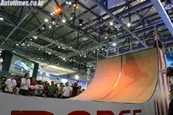 복층 구조로 1층엔 전시관을, 2층에는 VIP 카페를 준비한 다임러크라이슬러코리아는 인라인 스케이트 묘기를 보여주는 ‘익스트림 스포츠’ 무대를 따로 준비했다. 또 하루 두 차례씩 탭댄스 공연으로 내방객들의 시선을 모은다. 어린이날에는 놀이기구인 요요 5,000개와 아이스크림 3,000개를 제공한다.