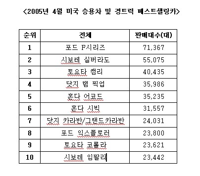 미국 빅3 중에서는 다임러크라이슬러만 호조를 보였다. 이 회사는 지난 4월 22만5,359대를 판매해 지난해 4월(20만7,405대) 대비 8.7%, 누적대수는 81만5,915대로 지난해 동기(77만4,096대)보다 5.4% 신장했다. 반면 최근 미국시장에서 대형 트럭 및 SUV의 인기하락으로 GM과 포드는 판매가 줄었다. GM은 38만535대로 전년동월(39만7,137대)에 비해 4.2%, 누적대수도 138만3,104대로 지난해 같은 기간(145만4,288)보다 4.9% 뒷걸음쳤다. 여러 디비전 중 캐딜락 및 폰티액만 소폭 증가했을 뿐 다른 브랜드들은 부진했다.