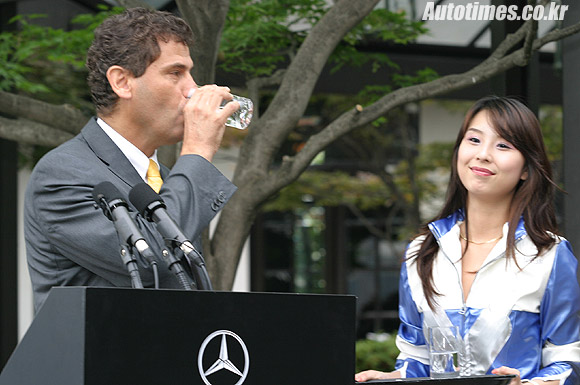 | 배기구를 통해 나온 물을 마시고 있는 이보 마울 벤츠코리아 대표. |