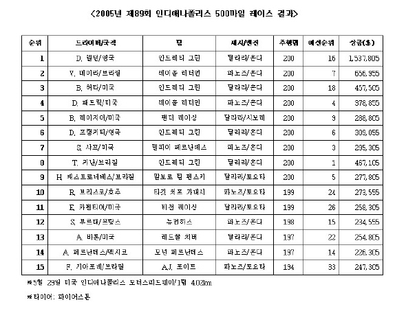 올해로 89회째를 맞은 인디500은 세계에서 가장 긴 역사를 자랑하는 레이스로 하루 관람객만 30만명이 넘는 세계 최대의 스포츠 행사다. 지난 5월말 열린 대회를 정리했다.