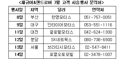 이번 행사는 8일 부산을 시작으로 9일 대구, 11일 대전, 12일 분당을 거쳐 13일과 14일엔 각각 서울 청담동과 남성대 골프연습장에서 진행된다. 시승차종은 재규어 뉴 XJ 시리즈, 뉴 S-타입, X-타입, XK 컨버터블과 랜드로버 뉴프리랜더, 디스커버리3 등이다. 시승을 원하는 사람은 각 전시장을 통해 신청하면 된다.