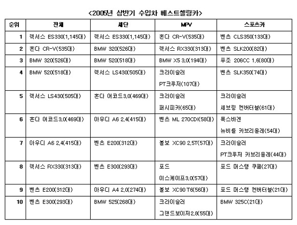 각 부문별로 봐도 일본차들의 강세를 읽을 수 있다. 세단과 MPV(SUV, 크로스오버카, 미니밴 포함)부문에서 ES330과 CR-V가 각각 수위에 오른 것. 그나마 스포츠카부문에서 벤츠 CLS 쿠페가 133대로 1위를 차지해 간신히 체면을 유지했다.