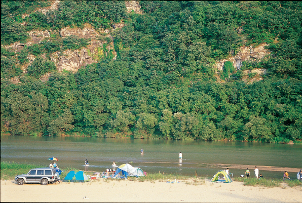 | 병산 아래로 흐르는 맑고 풍성한 물줄기와 백사장. |
