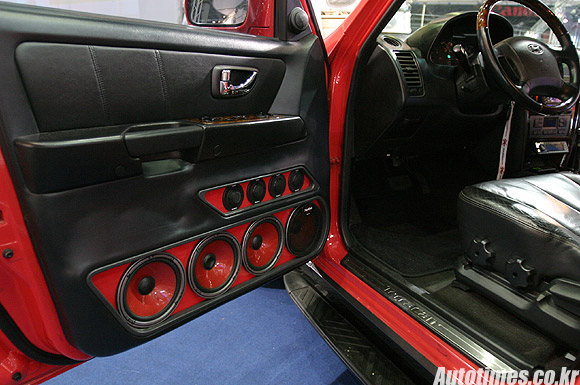소니코리아의 오디오 시스템에서 사람들의 관심을 끄는 건 서브우퍼와 스피커 그리고 앰프다. 뒷공간을 꽉 채운 레드 스타일의 바탕에 24개의 XS-1235D4 서브우퍼는 그 모습만으로도 웅장하다. 여기에 앞도어에 마련된 XS-HL635 모델의 스피커, 바닥에 구성된 4대의 XM-7547 앰프는 4채널 180W의 출력으로 각 오디오 시스템이 최적의 소리를 낼 수 있게 한다. 또 소니 XDP-4000X 디지털 프로세서로 전체 시스템을 총괄하고 있으며, 부족한 전원의 공급을 위해 2개의 배터리와 전원보강장치인 파워 코어를 장착했다.