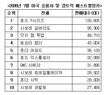 지난 7월 미국 승용차 및 경트럭(픽업, SUV) 판매에서 GM, 포드, 크라이슬러 등 미국 빅3가 오랜만에 좋은 실적을 거뒀다고 오토모티브뉴스가 2일(현지 시간) 보도했다. 또 토요타와 닛산은 미국 판매를 시작한 이후 가장 좋은 성과를 올렸다.