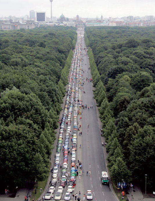 독일 베를린의 전승기념탑 앞 도로에서 열린 영화 ‘허비, 첫 시동을 열다(Herbie fully loaded)’의 프리미어 시사회에 수천 대의 폭스바겐 비틀이 몰려들었다.