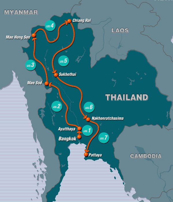 레그1에서 레그7까지 총 10개의 스페셜 스테이지(총 길이 1,140km)로 구성된 아시아 크로스컨트리 랠리는 2,080km의 이동거리조차 랠리라고 할 정도로 험준하다. 방콕을 출발해 태국의 산악지역을 거쳐 치앙레이를 돌아 관광도시인 파타야까지 가는 이번 경기는 태국정부와 태국관광청, 오토박스, 요코하마 등이 후원한다.