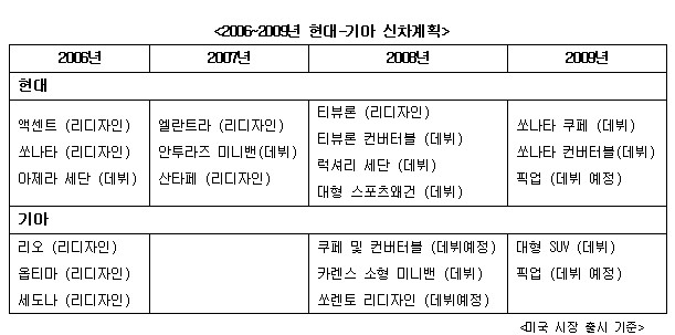 두 브랜드는 현재 판매중인 차들의 풀모델체인지는 물론 신차들에도 획기적인 변화를 준비하고 있다. 2010년까지 미국 소비자들은 현대 및 기아 엠블럼을 단 소형 미니밴, 고급 세단 및 픽업 등 전혀 새로운 부문의 차까지 만날 수 있다는 것.