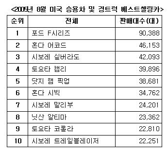 모델별로는 포드 F시리즈가 9만388대로 1위를 지켰으며 혼다 어코드가 4만6,153대로 2위를 차지했다. 3~7위의 중위권은 시보레 실버라도(4만2,093대), 토요타 캠리(3만9,896대), 닷지 램 픽업(3만8,681대), 혼다 시빅(3만4,762대), 시보레 말리부(2만4,201대) 순이었다. 그 뒤를 닛산 알티마(2만3,362대), 토요타 코롤라(2만2,810대), 시보레 트레일블레이저(2만2,251대)가 이었다.