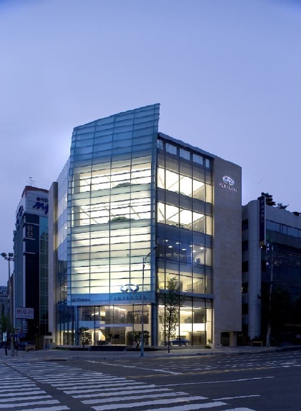 한편, 250여평 대지에 건평 950여평 규모의 6층 단독 건물로 건립된 인피니티 강남 전시장은 지하 1층에 퀵서비스 시설이 있고, 최고급 호텔 로비의 분위기를 내는 1층 로비에 리셉션 데스크와 차 인도를 위한 카페를 마련했다. 2층은 고객상담을 위한 라운지와 미니 컨셉트카들이 전시된 인피니티 갤러리로 꾸몄고, 3층은 고객 차 대기를 위한 주차장, 4층은 사무실이다. 자동차 점검이나 수리를 위해 내방한 고객은 2층에서 자신의 차가 수리되는 과정을 모니터로 확인 하면서 간단한 음료를 마시며 인터넷 이용, TV 시청 등을 할 수 있다. 또 전시장과 고객상담실로 구성된 5~6층은 마치 예술품을 감상하듯 여유로운 분위기에서 차를 편안하게 느낄 수 있도록 배려한 인피니티 전시장만의 디자인 철학이 반영됐다.