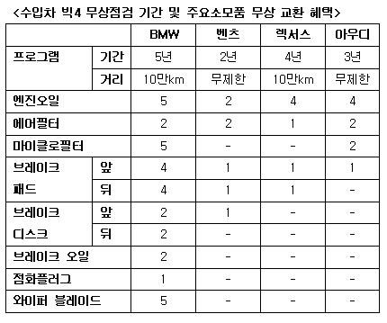 BMW, 벤츠, 렉서스, 아우디 등 빅4 가운데에서는 무상점검 항목 및 횟수가 가장 많은 곳은 역시 BMW, 가장 적은 곳은 벤츠였다. 엔진오일 교환의 경우 BMW는 5회, 렉서스와 아우디는 각 4회씩 무상교환해주는 반면 벤츠는 2회에 불과하다. 마이크로필터는 BMW가 5회, 아우디가 2회 각각 무상교환해주나 렉서스와 벤츠는 아예 혜택이 없다. 브레이크 패드는 BMW가 4회, 나머지 업체는 1회였다. 또 브레이크 오일, 점화플러그, 와이퍼는 BMW만이 각각 2회, 1회, 5회를 바꿔준다.