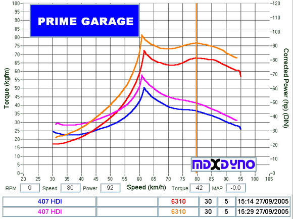 작업결과 407HDI는 최고출력이 프라임게라지 다이노 시스템 상 82마력(제원표 상 138마력)에서 95마력(160마력)으로 향상됐고, 최대토크는 5.0kg·m 정도 높아졌다. 주행테스트에서도 이전의 무거운 느낌에서 벗어난 모습을 보여줬다. 마치 휘발유엔진차와 같은 가뿐한 성능을 발휘한 것.