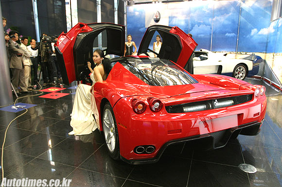 이 날 소개된 엔초 페라리는 페라리 역사상 가장 빠른 도로용 스포츠카로 창업자에 경의를 표하는 의미에서 그의 이름을 따 모델명을 정했다. V12 5,988cc 660마력 엔진을 얹어 최고시속 350km, 최대토크 67.0kg·m, 출발 후 시속 100km 도달시간 3.65초의 성능을 자랑한다. 또 출발 후 19.6초면 1km를 주파할 수 있다. 피닌파리나가 디자인한 외관은 단단하면서도 깔끔한 인상을 주며 앞부분에 각이 살아 있는 대형 공기흡입구로 대담한 분위기를 자아낸다. 옆라인은 좁고 볼록하게 디자인해 F1 머신을 연상시키며 걸윙도어 방식이다. 차체는 카본 화이버와 알루미늄 등으로 만들었으며 인테리어 역시 스티어링 휠, 페달 등 주요 내장 표면을 카본 화이버로 마무리했다. 가격은 25억원이나 이 차를 기다리고 있는 국내 고객이 3명이어서 이 날 전시가 끝나면 주인을 찾아갈 예정이다.