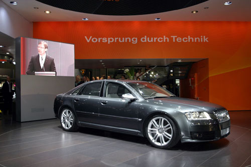 A8을 기본으로 스포티함과 파워를 보강한 모델. 디자인은 A8의 역동적인 면을 그대로 살렸고 싱글 프레임 그릴엔 S8 엠블럼이 새겨져 있다. 그릴 아래 3개의 공기흡입구와 헤드라이트 아래의 대형 공기흡입구 등이 강한 분위기를 풍긴다. 엔진은 V10 5.2ℓ FSI로 직접분사방식으로 최고출력 450마력, 최대토크 55.1kg·m, 0→시속 100km 도달시간 5.1초, 최고제한시속 250km의 성능을 낸다.