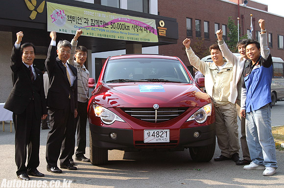 쌍용은 자동차동호회연합(대표 이동진)과 한국복지재단(대표 김상원) 등과 함께 2일부터 50일간 "도전, 액티언 5만km 릴레이 기부행사"를 시작한다고 밝혔다. 쌍용이 주최하고 자동차동호회연합(www.carmania.net ; 이하 자동연)이 주관하는 이 행사는 국내 172개 자동차동호회 연합체인 자동연 72만명의 회원 중 150명이 참가, 릴레이로 전국 곳곳의 도로를 하루 1,000km씩 달려 50일만에 5만km를 주파하는 것. 참가자들은 일반인이 3년을 주행할 거리인 5만㎞를 50일만에 달려야 하며, 5만km를 완주할 경우 총 1,000만원의 기부금을 한국복지재단이 운영하는 중증장애인 요양시설 "한사랑마을"(원장 강태환)에 기부하게 된다. 쌍용은 이번 행사에 액티언을 제공하는 것 외에 동호인들이 완주에 성공할 경우 참가자가 적립하는 금액에 해당하는 1,000만원의 기부금을 매칭 그랜트(Matching Grant) 형식으로 한사랑마을에 기부한다.