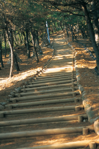 | 전망대로 오르는 오솔길. 소나무가 빽빽히 도열한 운치있는 길이다. |