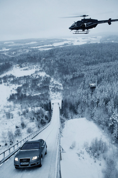새 광고는 케이블 TV, 서울지역 영화관, 도심지역에 설치된 LED 전광판, DMB폰 등에서 방영한다. 광고내용은 눈으로 뒤덮인 핀란드 카이폴라에서 A6 4.2 콰트로가 37.5도 급경사의 피카보리 스키 점프대를 거슬러 오르며 상시 4륜구동 콰트로의 성능을 보여준다는 것. 아우디는 광고촬영을 위해 차 타이어에 랠리 경주에 사용하는 6mm 스파이크를 장착한 후 다른 인위적인 도움없이 높이 47m의 눈덮인 스키 점프대를 올랐다고 설명했다. 촬영중 차가 뒤로 밀리는 것에 대비해 안전장치를 달았으나 차가 스키 점프대에 오르는 데엔 전혀 영향을 미치지 않았다는 것.