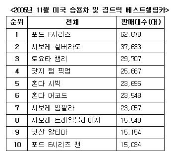 11월중 미국시장에서 모델별 판매순위는 포드 F시리즈가 6만2,878대로 부동의 1위를 지켰으나 지난 여름 10만대 넘게 판매됐던 것에 비하면 크게 줄었다. 3만7,633대로 2위를 차지한 시보레 실버라도 역시 9만대 이상의 실적을 보였던 올 여름보다 크게 감소했다. 3위는 2만9,707대의 토요타 캠리가 차지했다. 4~6위의 중위권은 각각 닷지 램 픽업(2만5,667대), 혼다 시빅(2만3,695대)과 어코드(2만3,548대) 등이 이었으며 그 뒤를 시보레 임팔라(2만3,057대)와 트레일블레이저(1만5,540대), 닛산 알티마(1만5,154대), 포드 E시리즈 밴(1만5,034대)이 이었다.