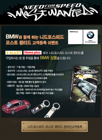 회사측은 번 아웃 리벤지와 번 아웃 레전드의 경우 오는 24일까지 온라인 고객 등록을 한 구매자들을 추첨, 1등 1명에게 내비게이션과 카오디오(3명), SK 10만원 상품권(10명), EA 인기타이틀(50명) 등을 제공한다. 니드 포 스피드 모스트 원티드는 오는 28일까지 온라인 고객등록을 마치면 추첨을 통해 1등 3명에게 BMW 주말 시승권과 BMW M3 미니어처(30명) 및 BMW 키홀더(70명)를 준다. SSX 온 투어를 사면 내년 1월말까지 제품 안에 스크래치 카드를 긁어 즉석에서 1등 5명에게 버튼 스키 풀세트를, 2등 5명에게는 버튼 스노보드 풀세트 등과 고급 고글(30명), 스키장갑(50명), 귀마개 에어백(100명), 성우리조트 리프트 할인권(100명) 등 다양한 경품을 선물한다.