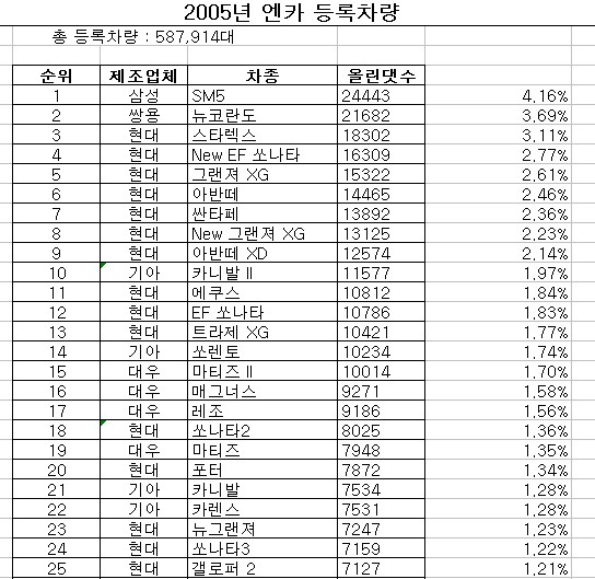 엔카네트워크가 올 1~11월 엔카닷컴(www.encar.com)에 등록된 국산차 58만대를 분석한 결과 그랜저XG와 뉴그랜저XG는 총 2만8,000대, EF쏘나타와 뉴EF쏘나타는 총 2만7,000대, SM5는 2만4,000대, 올뉴아반떼와 아반떼XD 및 뉴아반떼XD는 2만2,000대가 순이었다. 아반떼의 경우 95년 이후 출시된 차를 합칠 경우 3만7,000대에 달했다. 메이커별로는 현대차 55.6%, 기아차 15.3%, 쌍용차 11.6%, GM대우차 10.8%, 르노삼성차 6.7%로 집계됐다. 등록된 차의 70~80%가 15일 이내에 팔리므로 등록순위는 판매순위로 볼 수 있다는 게 엔카측 설명이다.