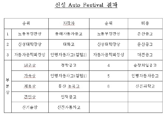 자작차 경주대회에서는 신기술, 내구 주행경기, 가속 및 제동 등을 놓고 26개 팀이 경쟁을 벌였다. 노동부장관상은 동해자동차공고(강원도 동해)가 차지했다. 신성대학장상은 대화고(강원도 평창), 자동차공학회장상은 인평자동차고 갤럽2팀(인천)에 각각 돌아갔다.