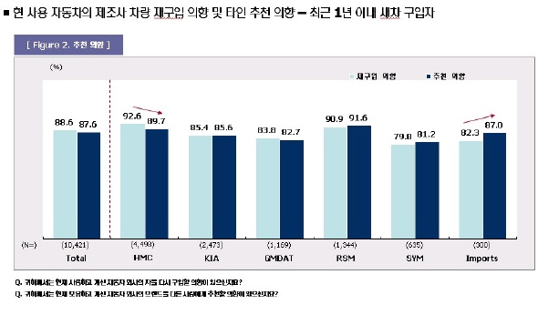 자동차 조사기관인 마케팅인사이트가 자동차 소유자 9만7,804명에게 지금 타고 있는 회사의 차를 다시 살 생각이 있는 지, 다른 사람에게 사라고 추천할 수 있는 지를 물었다. 같은 회사 차를 다시 사겠다는 응답이 가장 많은 메이커는 현대로 92.5%에 달했다. 르노삼성차 소유자들이 90.8%로 그 뒤를 이었다. 수입차 81.9%, 기아차 79.9%, 쌍용차 73.8%, GM대우차 72.1% 순이었다. 지금 타고 있는 메이커의 차를 재구입하겠다는 의사는 전체 평균 84.7%였다.