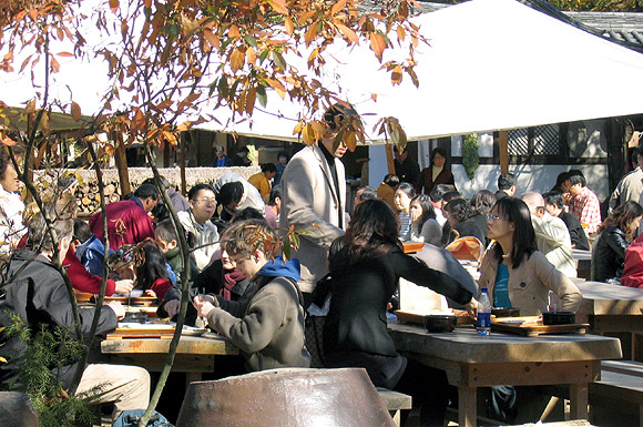 초가지붕 위에 멋스럽게 쌓인 낙엽들, 알몸으로 처마 끝에 매달려 곶감이 되어가는 주황빛 감들, 장독대 위에 드러누운 낙엽들의 흔적, 수숫대가 매달린 뒤뜰 처마 아래에는 똥장군이 지게에 여태껏 올려져 있다. 마을 한쪽으로 실개천이 흐르고, 그 위로 나무다리가 운치있게 가로질러 놓인 곳을 지나면 갑자기 사람들로 붐빈다. 역시 장터다. 혁필, 유기, 탈, 악기, 부채, 담뱃대 등을 직접 만들어 파는 공방거리는 아이들의 호기심을 한껏 자극한다. 국밥냄새가 구수한 흰 차양 아래에는 시장기를 달래려는 사람들이 주모를 부른다. 국밥을 말아먹는 이, 동동주에 녹두전을 곁들이는 이, 도토리묵 한 그릇을 초장에 결딴내고도 엿장수 가위질에 엿판으로 눈길을 보내는 이도 있다.