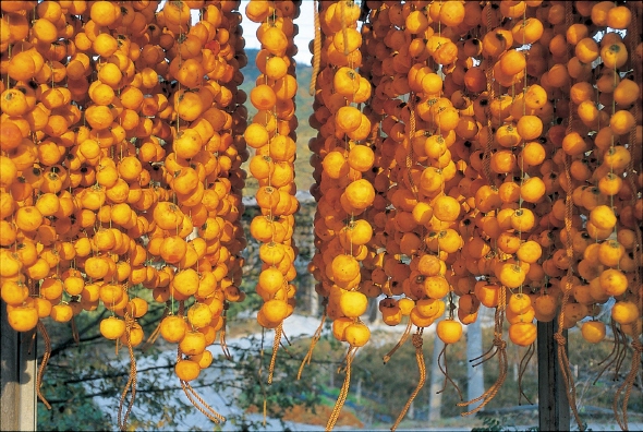 ‘곶감 고장’으로 유명한 경북 상주. 상주에서도 노음산 아래 위치한 외서면 남장리는 상주 곶감의 대표적인 생산지다. 이 맘 때 그 곳을 찾으면 온동네에 주황빛 알전등이 환하게 켜진다. 건조장은 물론이고 집집마다 처마 밑에 감타래가 발처럼 매달려 있다. 곶감을 만들기 위해 껍질을 벗겨낸 알몸의 감을 줄줄이 엮어 타래를 만들어 놓았기 때문이다. 이렇게 찬 바람에 말려지는 감들은 한 달에서 한 달 보름 정도면 맛있는 곶감이 된다. 대략 11월말부터 이듬해 3월까지가 곶감이 출하되는 시기.