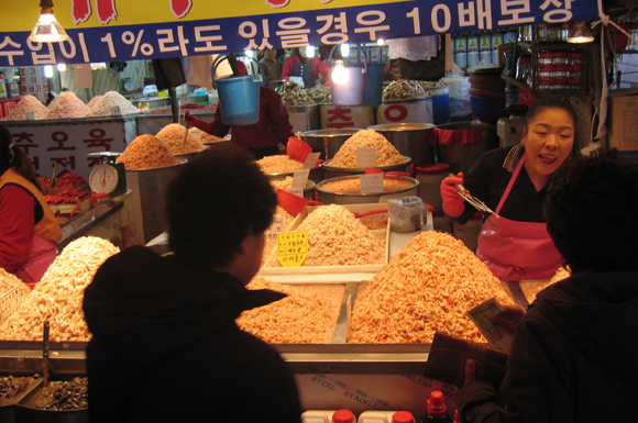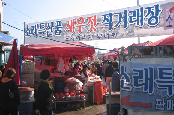 비릿한 갯내음이 이끄는 대로 발길을 옮기면 포구와 머리를 맞댄 어시장과 연결된다. 백열등이 불밝힌 시장 안으로 들어서면 젓갈 드럼통이 즐비하게 이어진다. 새우파시로 유명한 곳인 만큼 새우젓 드럼통이 대중을 이루지만 멸치젓, 꼴뚜기젓, 속젓, 밴댕이젓, 게젓 등 갖가지 종류의 젓갈들로 ‘젓갈 백화점’이라는 명성을 새삼 확인시켜준다. 특히 소래는 생새우가 유명해 김장철이면 펄떡펄떡 뛰는 신선한 생새우를 고르려는 주부들의 발길로 더욱 붐빈다. 또 보통사람 눈에는 모두 그 게 그 것처럼 보이지만 시장 안을 조금만 돌다 보면 새우젓에도 종류가 있어 김장할 때 넣는 것, 밥반찬으로 먹는 것 등 육젓, 오젓 구별하는 눈도 생긴다. 삼지창처럼 생긴 포크로 젓갈을 쿡쿡 찍어 올려 권하는 상인의 손길을 거절치 못하다 보면 그야말로 ‘짠맛’을 제대로 보게 된다.