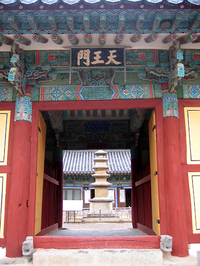 천왕문 너머로 5층 석탑이 보이는 풍경. 이 단정한 정경은 보경사를 대표하는 모습이다. 일명 금당탑이라고 불리는 5층 석탑은 적광전 앞에 세워져 있다. 적광전은 삼존불을 모신 곳으로 창건연대는 정확히 알수 없고 숙종 3년(1677)에 중건, 몇차례 중수가 있었으나 보경사 경내에 현존하는 건물 중 가장 역사가 깊다. 조선 중기 사찰 건축의 특징을 잘 보여준다.