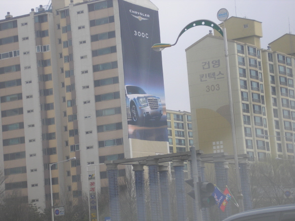킨텍스를 찾는 사람들 눈에 가장 잘 보이는 한 아파트의 벽면 전체에 자동차회사의 광고현수막이 내걸렸다. 다임러크라이슬러코리아가 내건 현수막은 크라이슬러와 닷지 그리고 짚의 브랜드와 크라이슬러 300C를 알리는 내용으로 구성돼 있다.