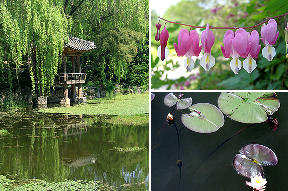 사각형을 이룬 호수는 온통 푸른빛이다. 축축 늘어진 수양버들 가지가 물 위까지 드리워졌고, 푸른 연꽃잎이 수면을 뒤덮었다. 수양버들 사이에 운치있게 자리 잡은 정자(파련정)가 더할 수 없이 고풍스럽다. 통나무를 엮어 만든 다리인 무심교도 멋스럽게 호수 한쪽을 가로질러 놓였다. 호수 한가운데까지 연결된 나무데크는 연꽃 군락지 연화원으로 가는 수련길이다. 물에서 자라는 부채붓꽃·미나리아재비·동의나물 등이 울창한 습지원에는 나룻배 한 척이 묶여 있다. 이 모든 게 한데 어우러져 빚어내는 호수의 풍경은 수목원의 하이라이트다.