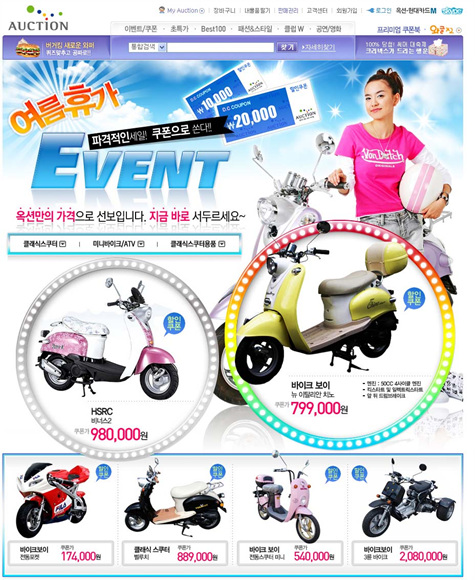 한편, 옥션은 여성 스쿠터족을 겨냥한 ‘여름휴가 스쿠터 할인이벤트’를 진행중이다. 오는 31일까지 열리는 이번 행사기간중 스쿠터를 구매하면 최대 20만원까지 깎아주고 3개월 무상 애프터서비스를 보장한다. 이번 행사에는 최고급 클래식 스쿠터 ‘뉴 이탈리안 치노’(시중가 90만원선)가 79만9,000원에 나왔다. 또 다양한 디자인의 헬멧(1만9,000~3만원)과 패션 핸들그립(1만5,000원), 방수커버(7,900원), 튜닝 휠 스티커(1,000~ 6,500원) 등 스쿠터 튜닝 제품 및 관리용품도 선보이고 있다.
