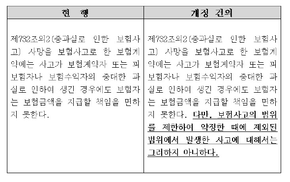 그는 “상법 개정을 통해 보험자와 보험계약자가 사전에 보험사고의 범위를 제한해 약정한 경우 그 범위 안에서만 보험자의 책임을 인정하도록 732조의 2를 개정해야 한다”고 강조했다. 그는 아울러 “국내 교통사고 사망률은 세계 최고 수준이고, 그 대부분은 무면허 또는 음주운전으로 발생하고 있다”며 “무면허 또는 음주운전에 대한 형사적·행정적 제재가 있으나 이와 더불어 보험으로 제재 또는 병행할 수 있는 관련 법규 또한 정비해야 할 필요성이 있다”고 개정의 필요성을 역설했다.