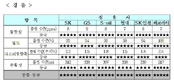 환경부가 올 상반기에 국내 5개 정유사가 수도권지역에 공급하는 자동차연료의 환경품질을 조사한 결과다. 환경부는 휘발유의 경우 발암물진인 벤젠, 오존형성물질 및 유해물질 배출을 늘리는 올레핀 등 6개 항목을 평가했다. 경유의 경우 자동차성능에 영향을 주는 윤활성, 배출가스 및 연료소비와 관련있는 밀도 등 4개 항목을 분석했다. 분석에 따르면 경유는 국내 모든 정유사가 국제 최고 수준의 환경품질을 갖춘 제품을 생산·판매하고 있었다. 자동차연료환경품질등급제가 처음 도입된 지난해에는 에쓰오일만 국제 최고 수준으로 평가받았다. 휘발유는 지난해 평가 때와 마찬가지로 국내 정유사 모두 국제 최고 기준에 가까운 수준을 유지했다.