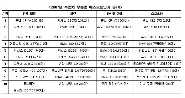 한국수입자동차협회의 모델별 등록대수에 따르면 2007년 판매된 수입차는 모두 294종으로, 5만3,390대가 신규 등록됐다. 이 가운데 157종의 세단이 3만7,817대, 78종의 RV 및 기타(SUV·해치백·밴·픽업트럭 등)가 1만2,849대, 67종의 스포츠카(쿠페·로드스터·컨버터블 등)는 2,724대였다.
